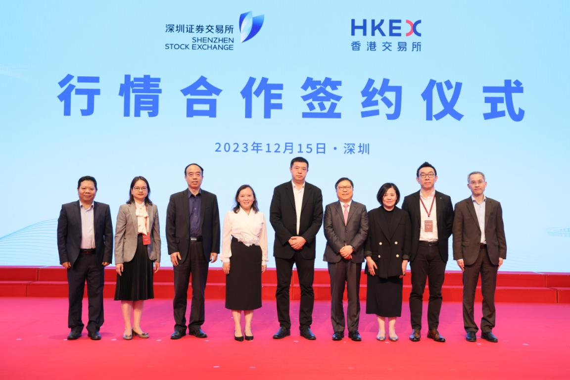 12月15日,在大灣區(qū)交易所科技大會(huì)主會(huì)場(chǎng),深交所與港交所隆重推出深港行情合作方案,并舉行合作協(xié)議簽約儀式。深證通陳明忠總經(jīng)理在儀式上代表公司與港交所資訊服務(wù)公司簽署合作協(xié)議。